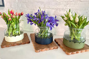 Elevate any space with the Scalloped Bloom Vase Duo, a striking blend of European heritage and modern versatility. This clear, wide-mouth glass vase features two interchangeable trays in crisp white and deep navy, each adorned with a scalloped edge inspired by Old World European craftsmanship.