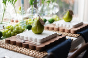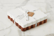 Discover the perfect blend of modern style and whimsical charm with our Scalloped Appetizer Cheese Board Duo. A one-and-done gift, this chic set of boards comes tied with luxe etúHOME ribbon and features 1 natural cutting board and 1 white serving board. The unique scalloped edges add movement and subtle femininity while the natural acacia wood grain adds texture to your countertop. With its trendy design, this functional piece of art will become a staple in any kitchen. Inspired by the classic architecture of 18th Century Europe, the Scalloped Collection captures this old-world charm while blending seamlessly into contemporary aesthetics.