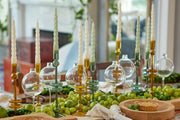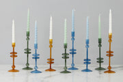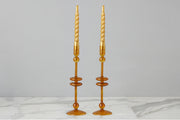Elevate your home decor with a pair of Amber Glass Candlesticks. These expertly crafted taper candle holders add a touch of timeless elegance to any room. Available in three sizes and colors, they are perfect for adding a pop of color to your dinner party or creating a statement throughout your home. Mix and match the sizes and colors to create a memorable tablescape.
