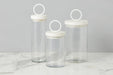 The Ring Top Canisters are a thoughtfully crafted storage set that brings modern elegance to everyday organization. Each canister features a tall silhouette made from recycled glass, paired with a distinctive top crafted from reclaimed mango wood and salvaged iron. The lids are fitted with rubber gaskets to help keep contents sealed and fresh—combining beauty with everyday function.